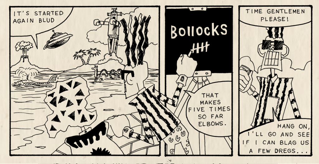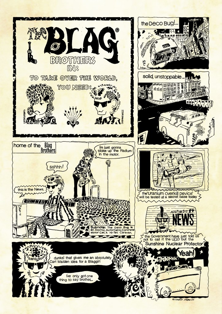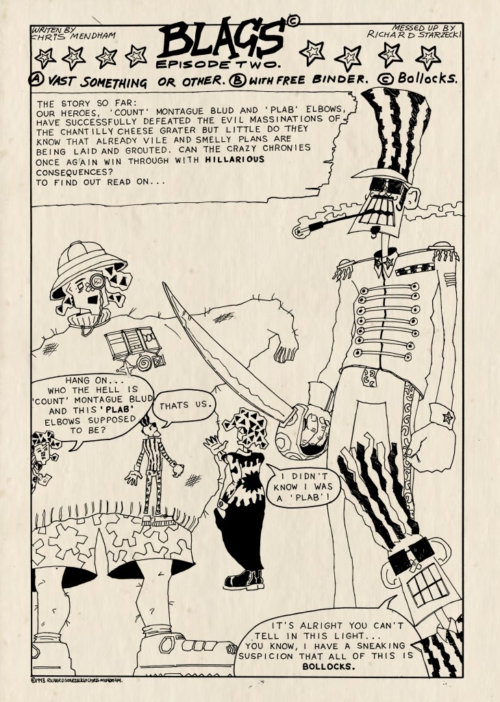 Blags is a comic universe that came into being during my time as a student at Watford College of Art in the 1980s. It is a joint enterprise with writer, artist, animator Chris Mendham. Over the past 40 years we have returned to the BLAGS world and the adventures of the BLAGS, ‘Elbows’ and ‘Blud’ in variety of projects from small press comics, short animations to feature film and TV scripts.