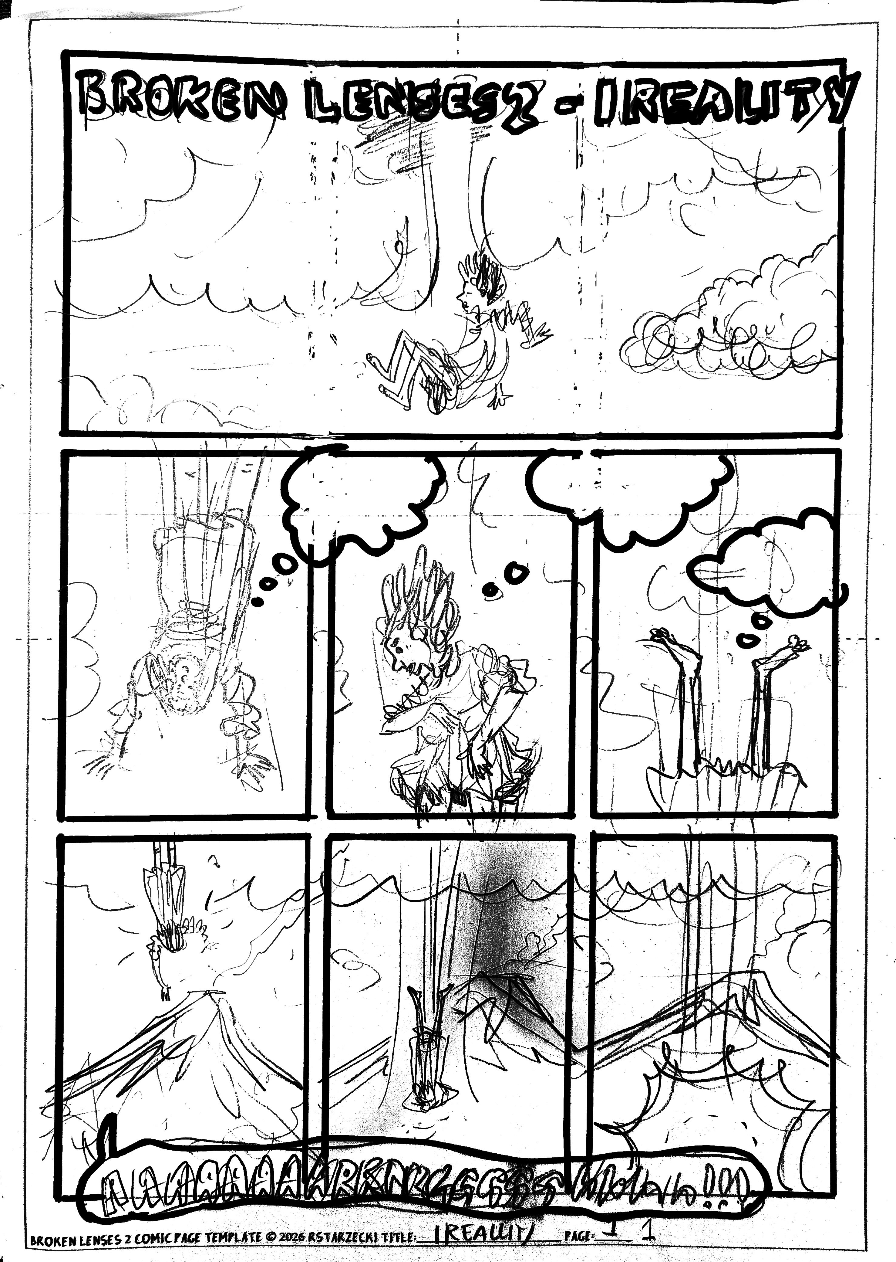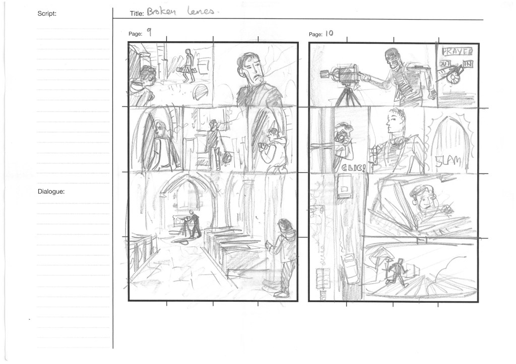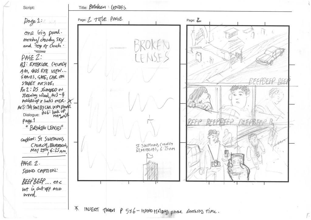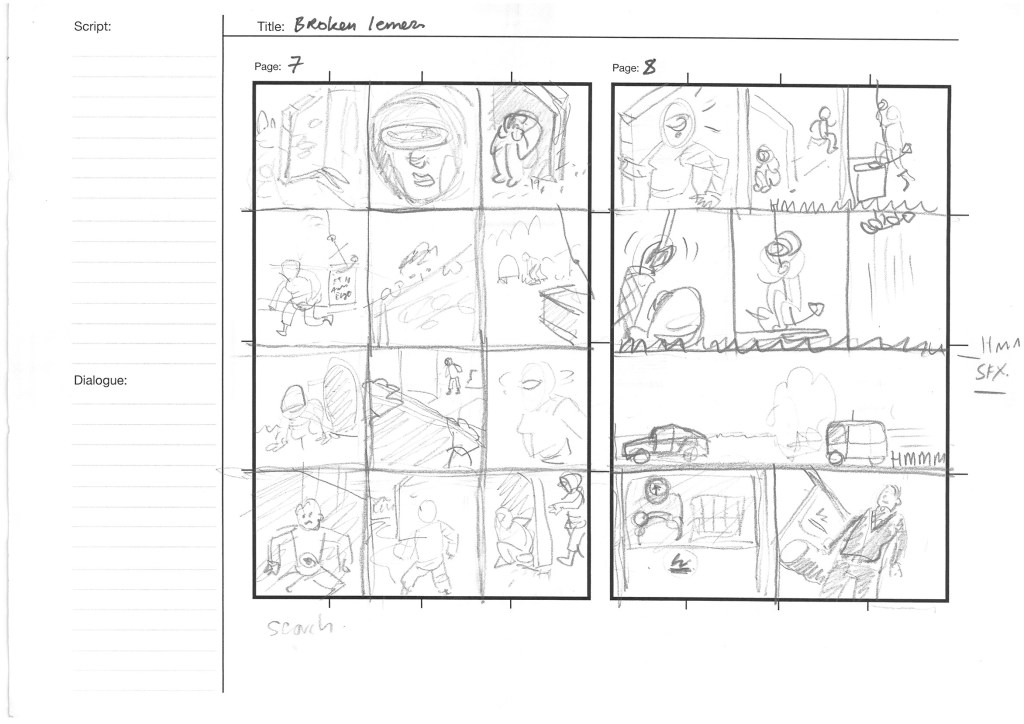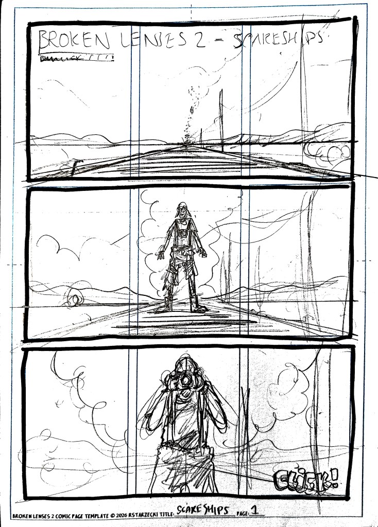 After an unexpected loft find of the fully worked-through plan for Broken Lenses 1, I decided to follow the plan, updating the artwork to suit how I work now. The Broken Lenses Redux became a thing. I returned to work as a lecturer in an FE college a little earlier than most other higher education institutions, and I started travelling by train again. Commuting 40 minutes to and from Swindon gave me the space to start putting the artwork pages together and developing the story further. Initially, I pencilled out pages and then inked onto board while travelling on a shaky train. I later graduated to Procreate for colour and tone, and after struggling for two years, I had the seventy-odd pages done in six months!
