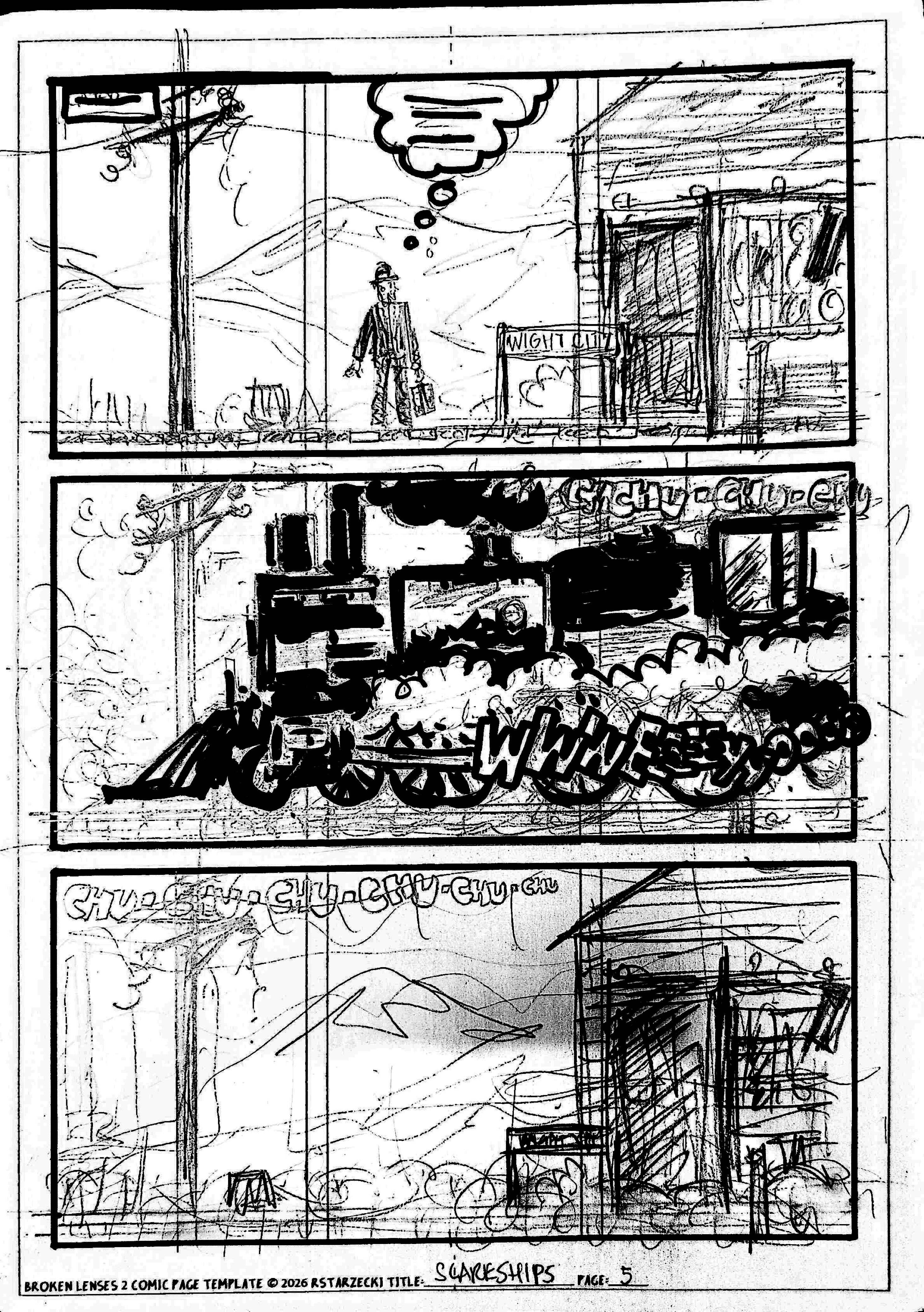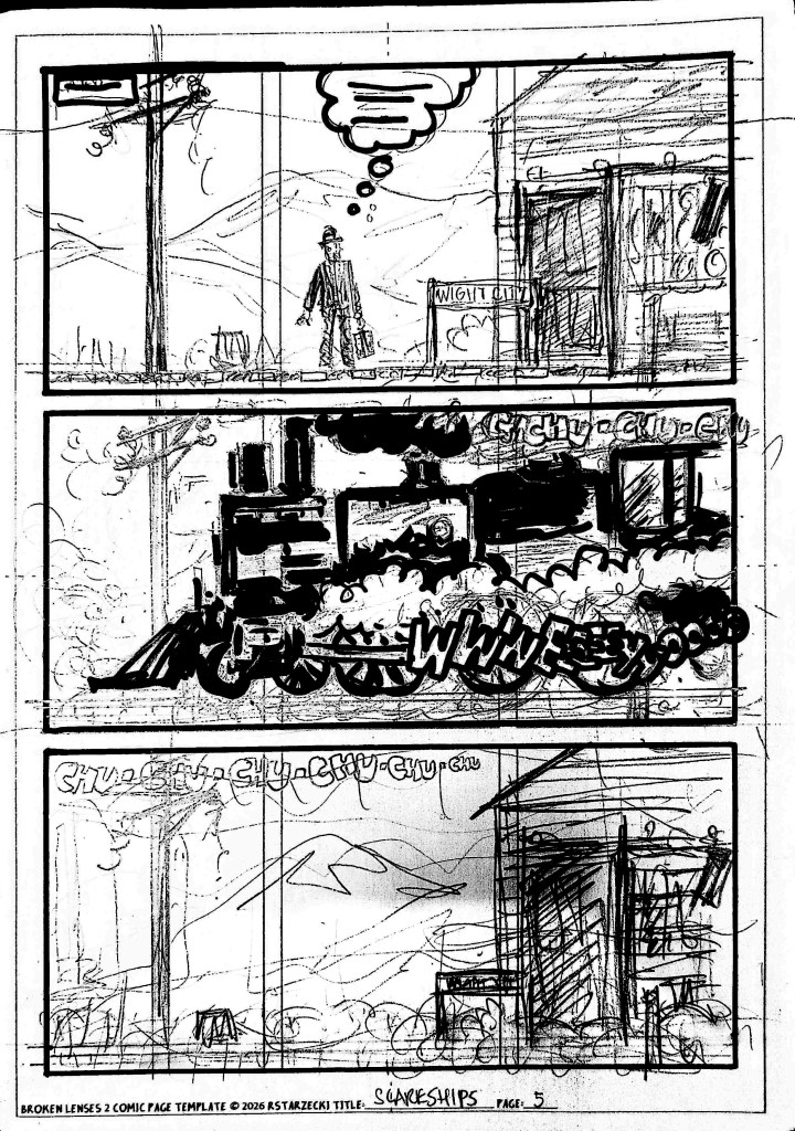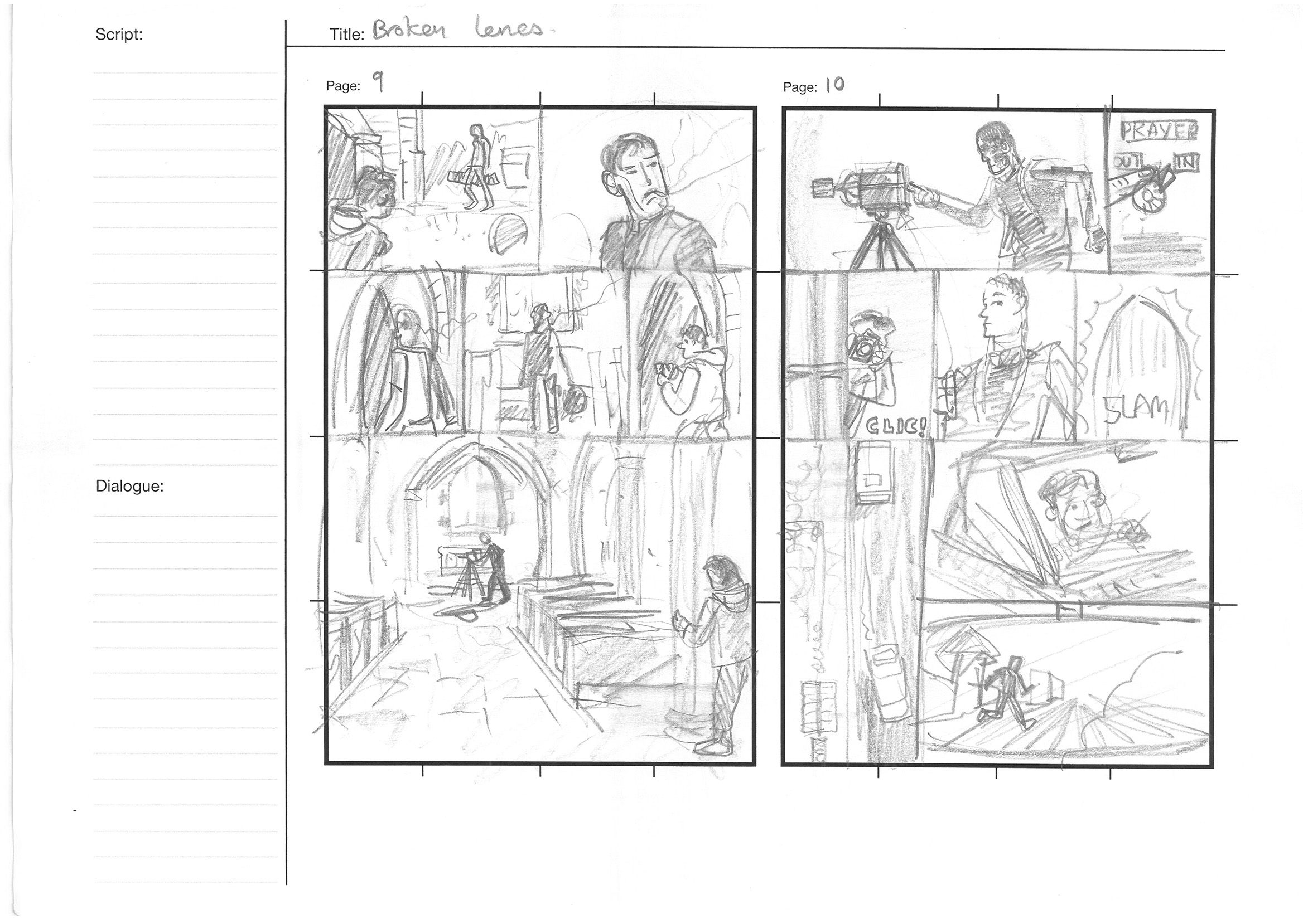 After an unexpected loft find of the fully worked-through plan for Broken Lenses 1, I decided to follow the plan, updating the artwork to suit how I work now. The Broken Lenses Redux became a thing. I returned to work as a lecturer in an FE college a little earlier than most other higher education institutions, and I started travelling by train again. Commuting 40 minutes to and from Swindon gave me the space to start putting the artwork pages together and developing the story further. Initially, I pencilled out pages and then inked onto board while travelling on a shaky train. I later graduated to Procreate for colour and tone, and after struggling for two years, I had the seventy-odd pages done in six months!