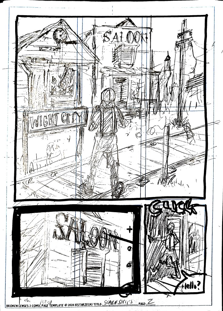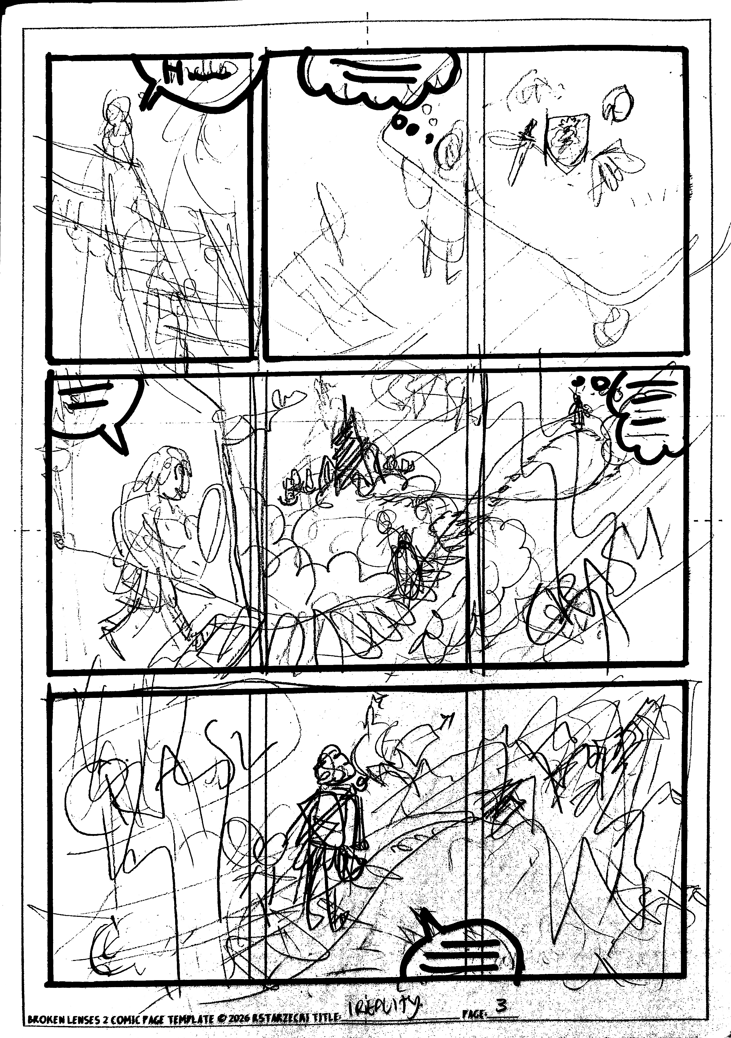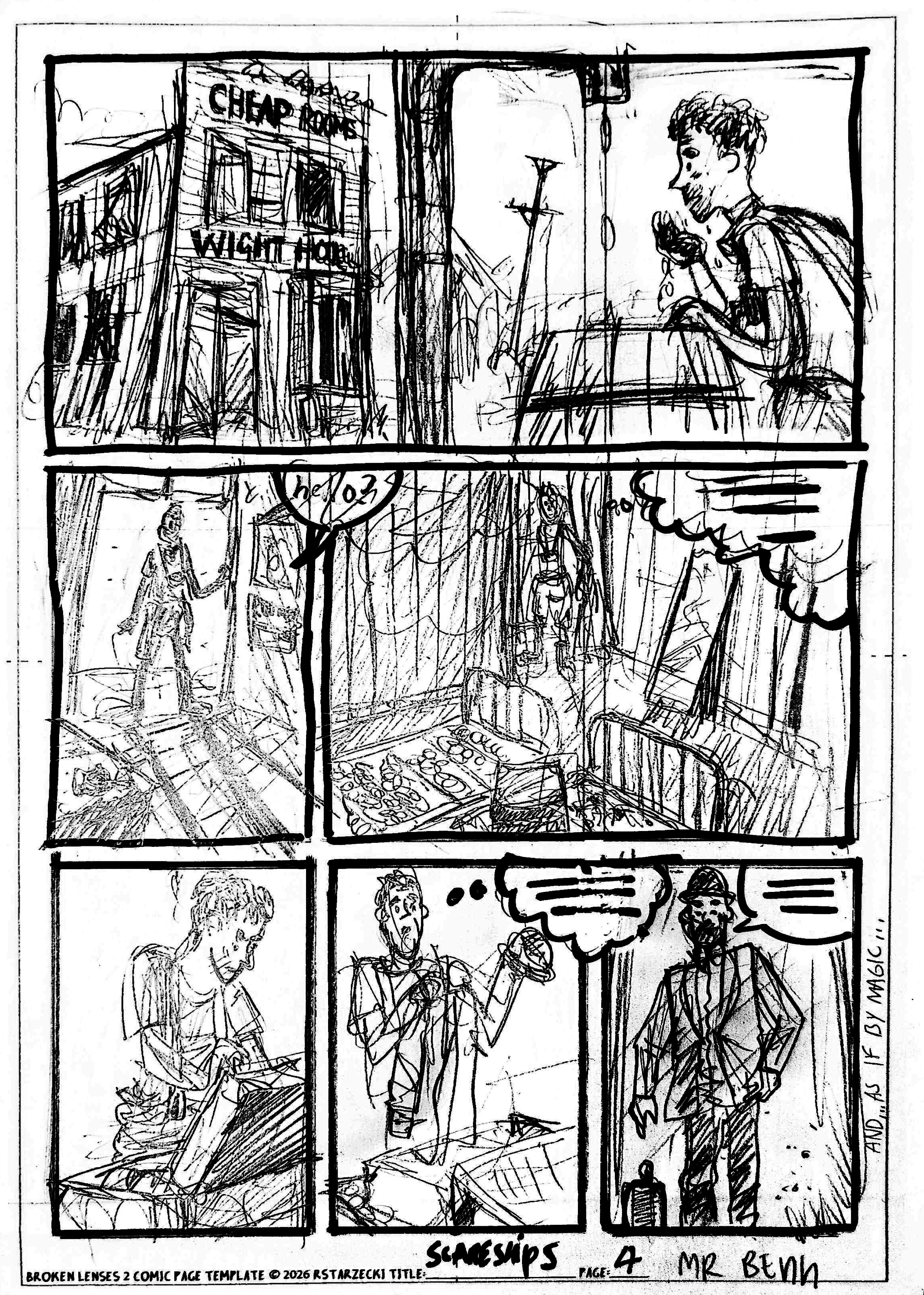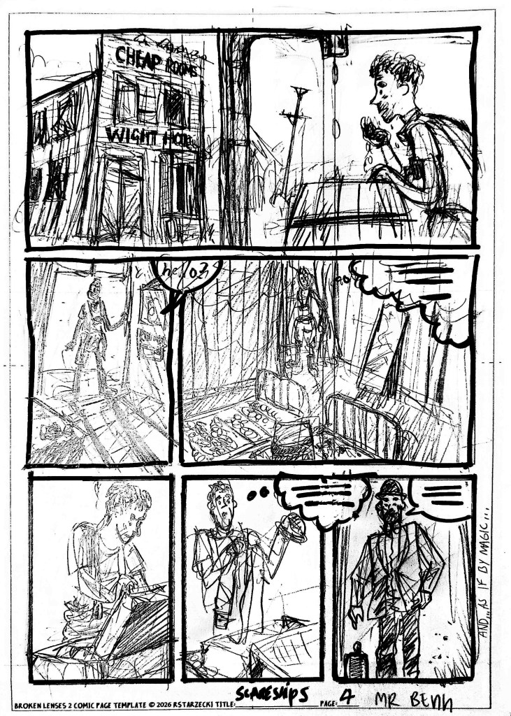 Well today I am going to update my progress on the second Broken lenses book. This is planned to be a ‘double sided’ book that features 2 stories that meet in the middle… the two working titles are ‘Scareships’ and ‘Ireality’ the first story carries on where we left Delwur in Part 1 and the other is following Myrii’s adventures after landing on the Magonian ship. I’m sketching out the pages and writing it at the same time. I have an overall idea of what is happening in each story bit the detail and new ideas tend to come as I sketch out the page layouts. This is the way like to work but not sure how efficient it is. I tell stories with pictures so those come first… here are some initial page roughs for the first few pages of each story… I will use this blog to keep a journal of the progress and I think it might be interesting to see how it develops and evolves…
