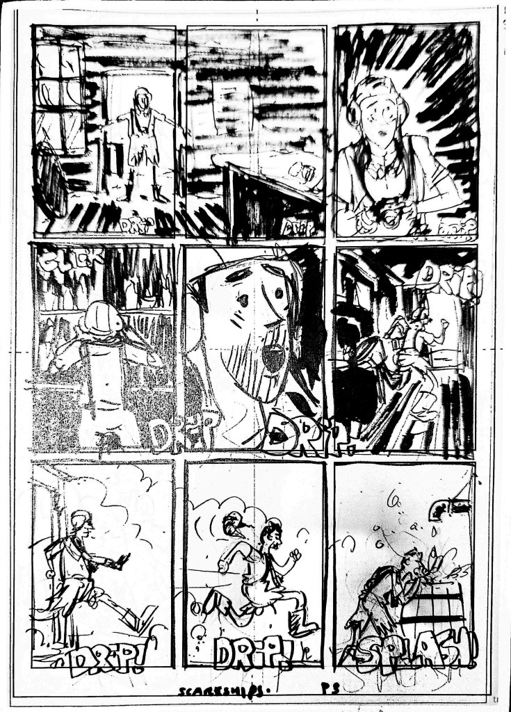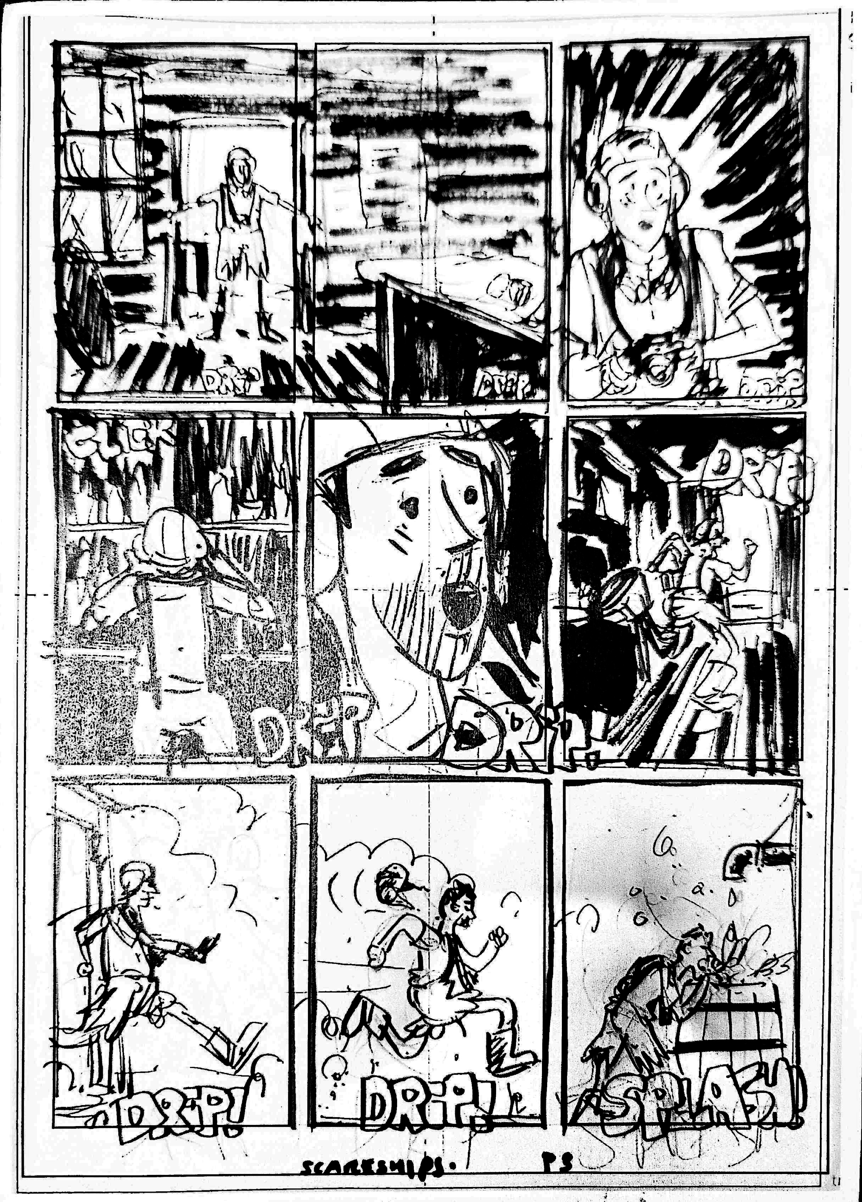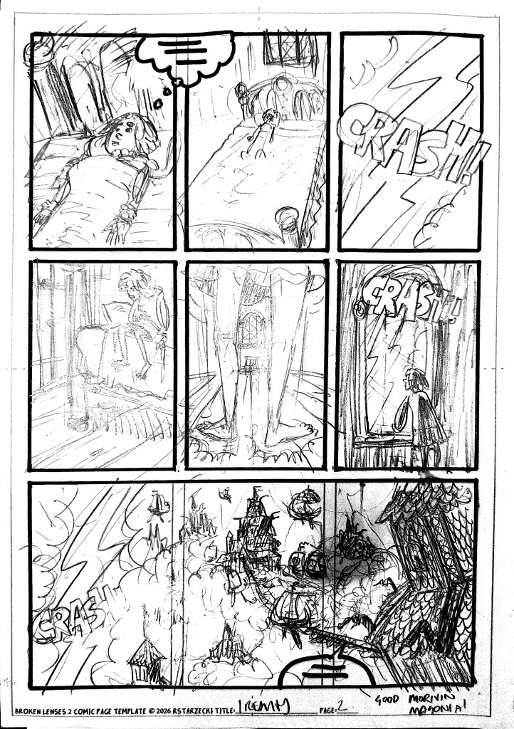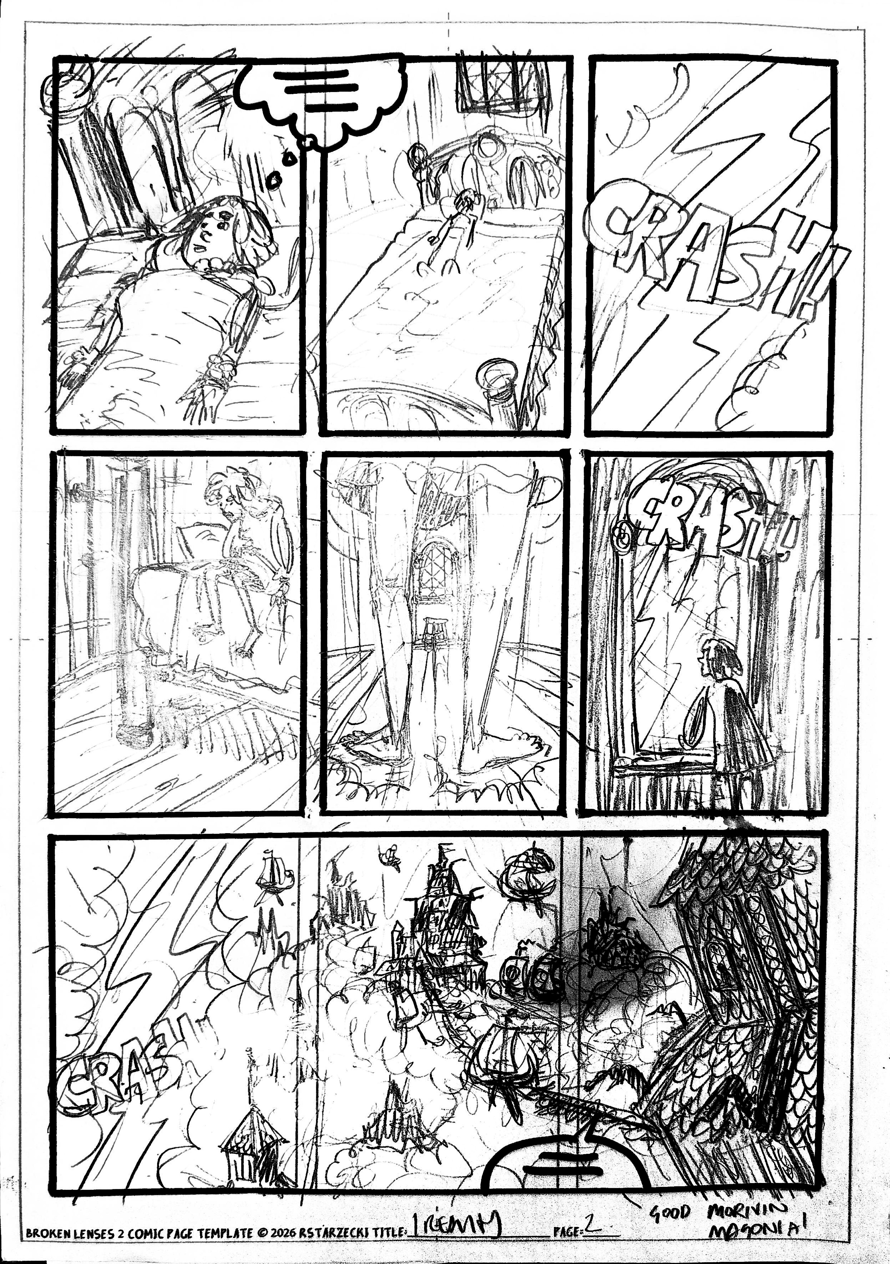 Well today I am going to update my progress on the second Broken lenses book. This is planned to be a ‘double sided’ book that features 2 stories that meet in the middle… the two working titles are ‘Scareships’ and ‘Ireality’ the first story carries on where we left Delwur in Part 1 and the other is following Myrii’s adventures after landing on the Magonian ship. I’m sketching out the pages and writing it at the same time. I have an overall idea of what is happening in each story bit the detail and new ideas tend to come as I sketch out the page layouts. This is the way like to work but not sure how efficient it is. I tell stories with pictures so those come first… here are some initial page roughs for the first few pages of each story… I will use this blog to keep a journal of the progress and I think it might be interesting to see how it develops and evolves…